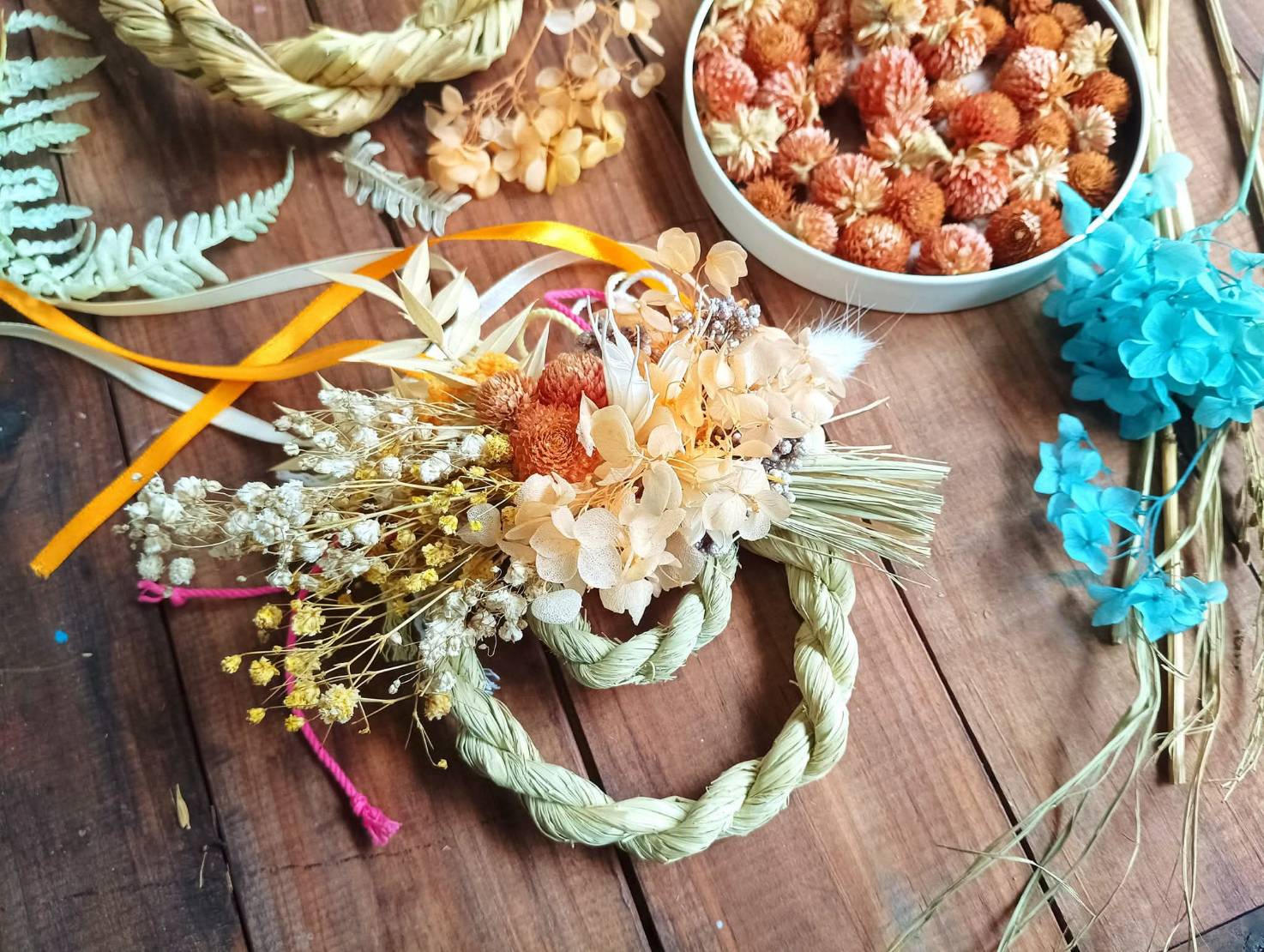 • 毛線、鋁線、貝殼、果實、永生花